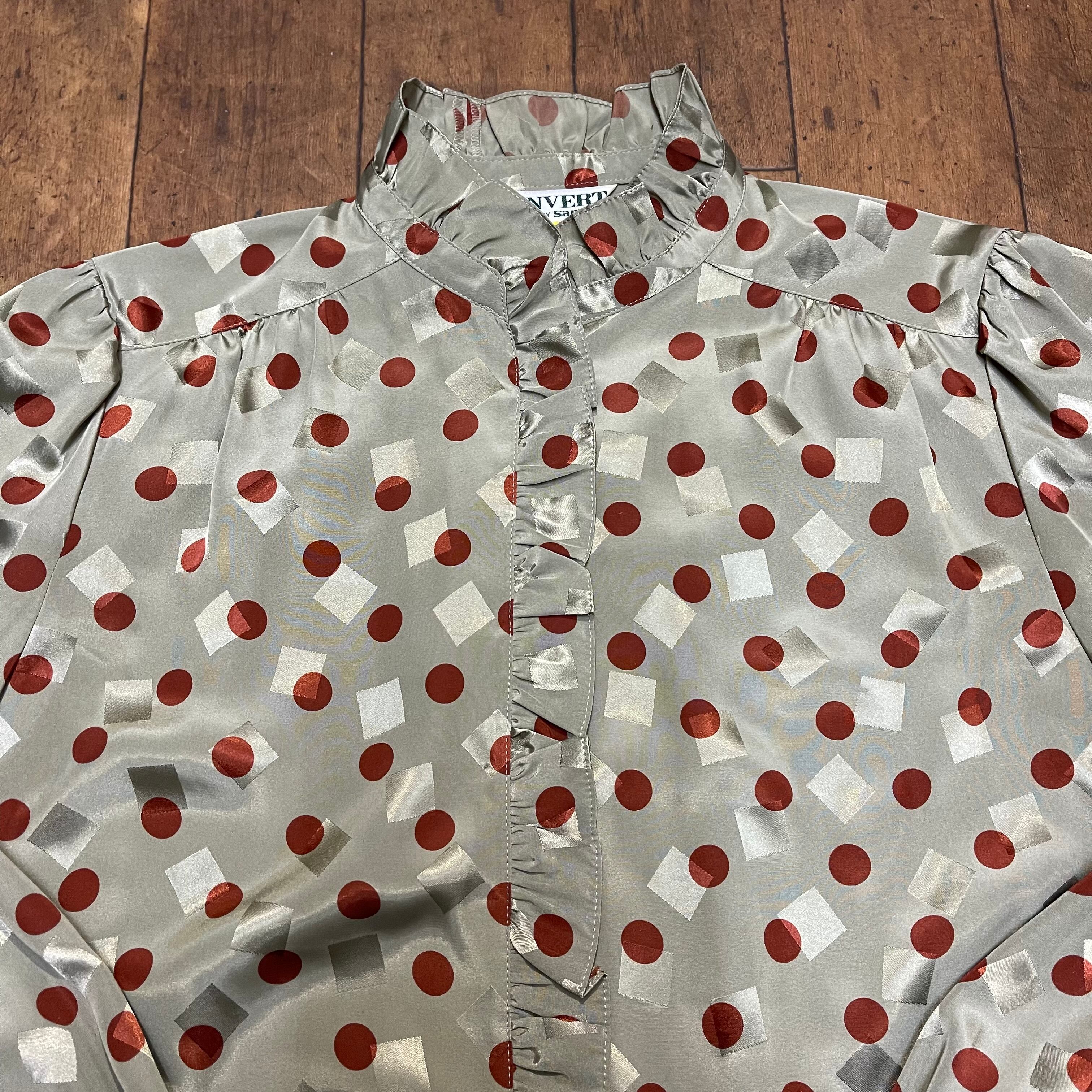 フリルスタンドカラー ドット 水玉 四角 柄 フライフロント シャツ レトロ ブラウス 61