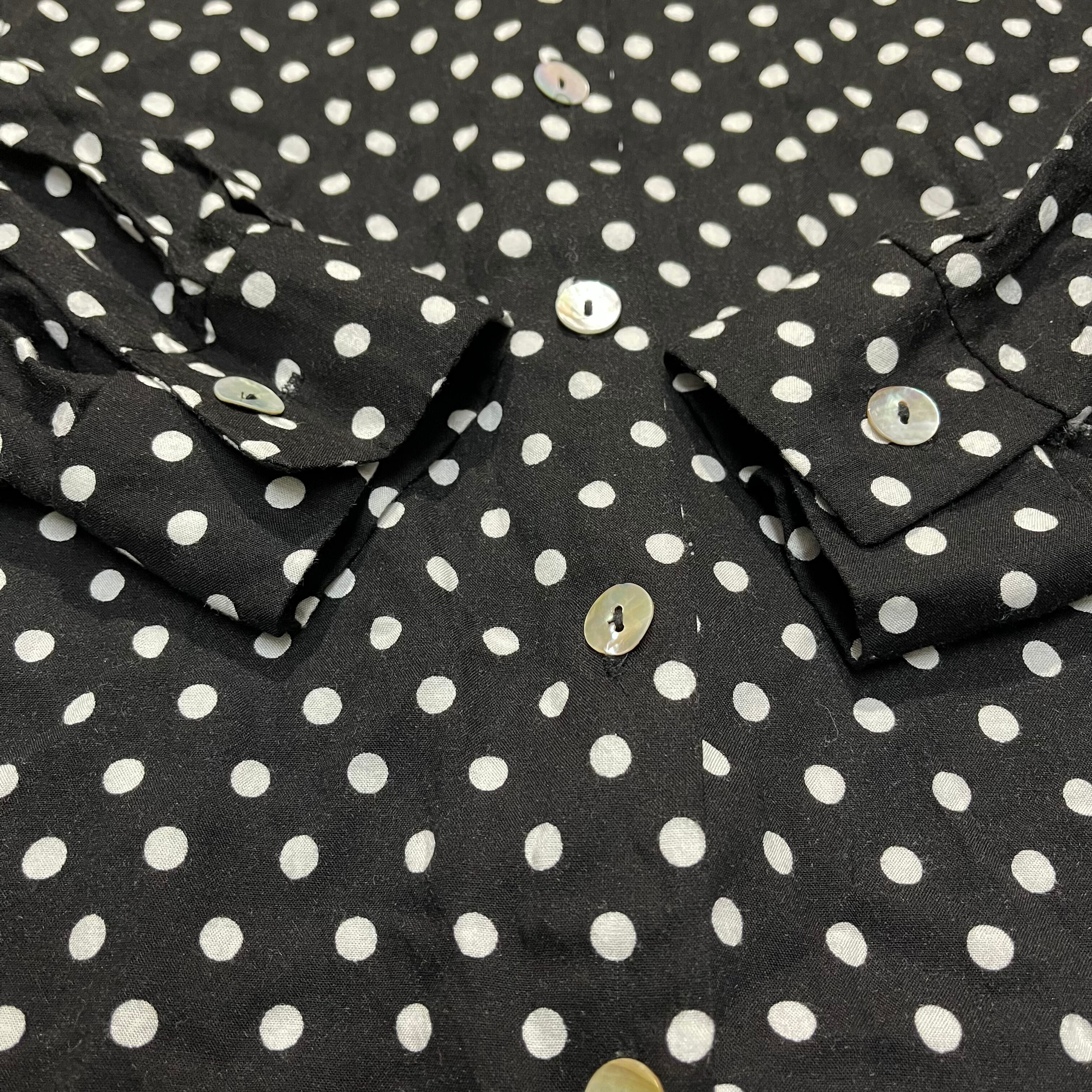 ・貝ボタンドット柄の大きめシャツです!サラッとした素材感でとても着やすいシャツです!定番の柄なので何にでも合わせやすく使いやすい一枚かと思います!貝のボタンもワンポイントになっていい感じです!