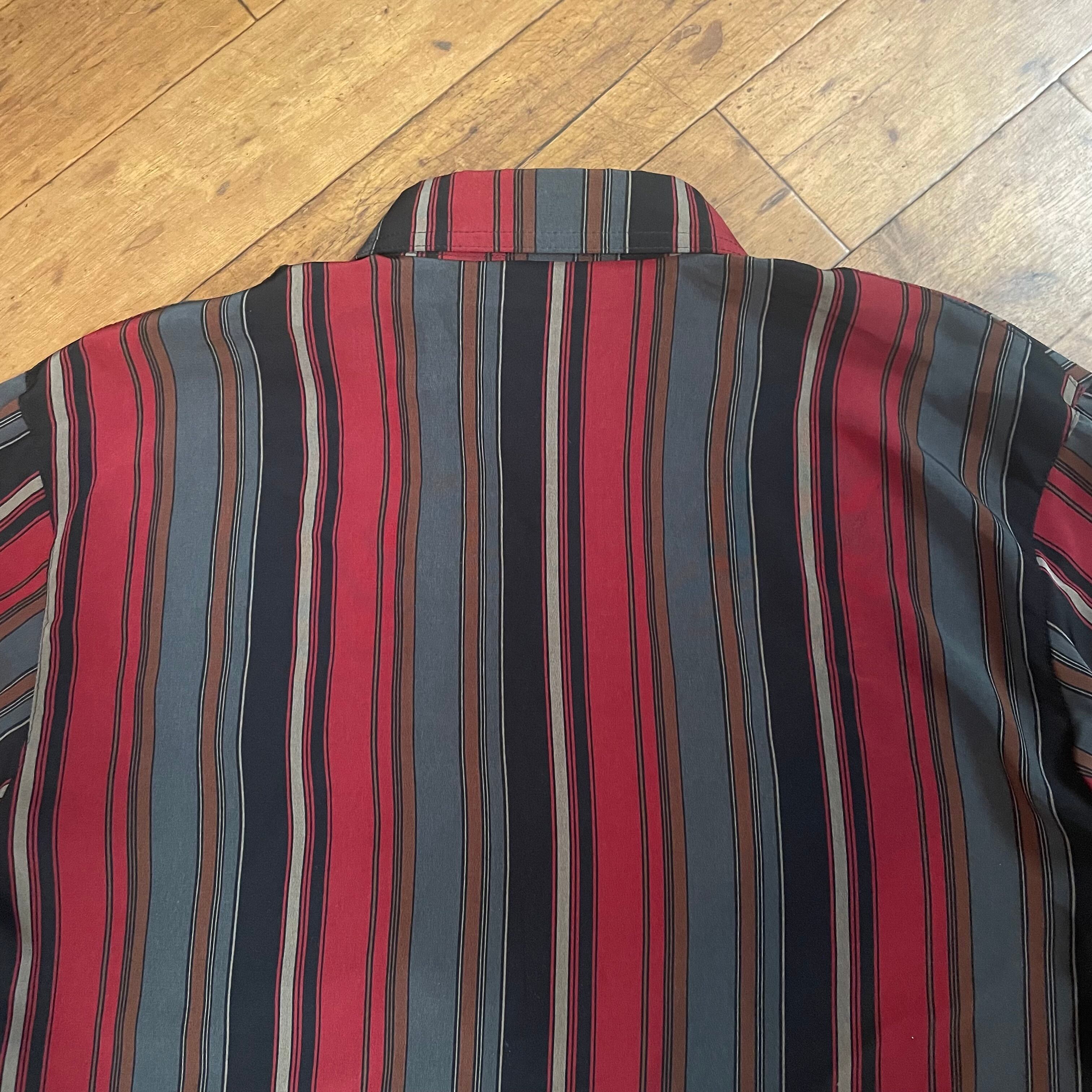 ・ブラウス 柄シャツ 長袖シャツ ロングシャツ ストライプ ポケット スタンダードカラー ワイン色 レトロ 136