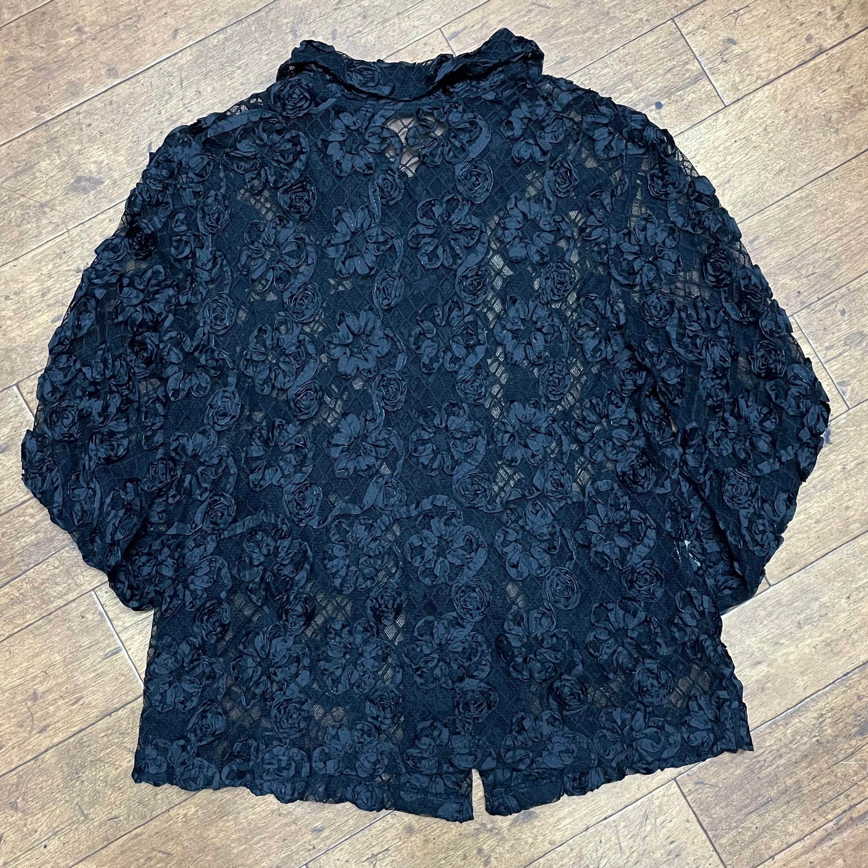 ・総レースのシアーブラウスです!黒一色ですが格子柄のレースに立体的なお花が上品に引き立って素敵です!