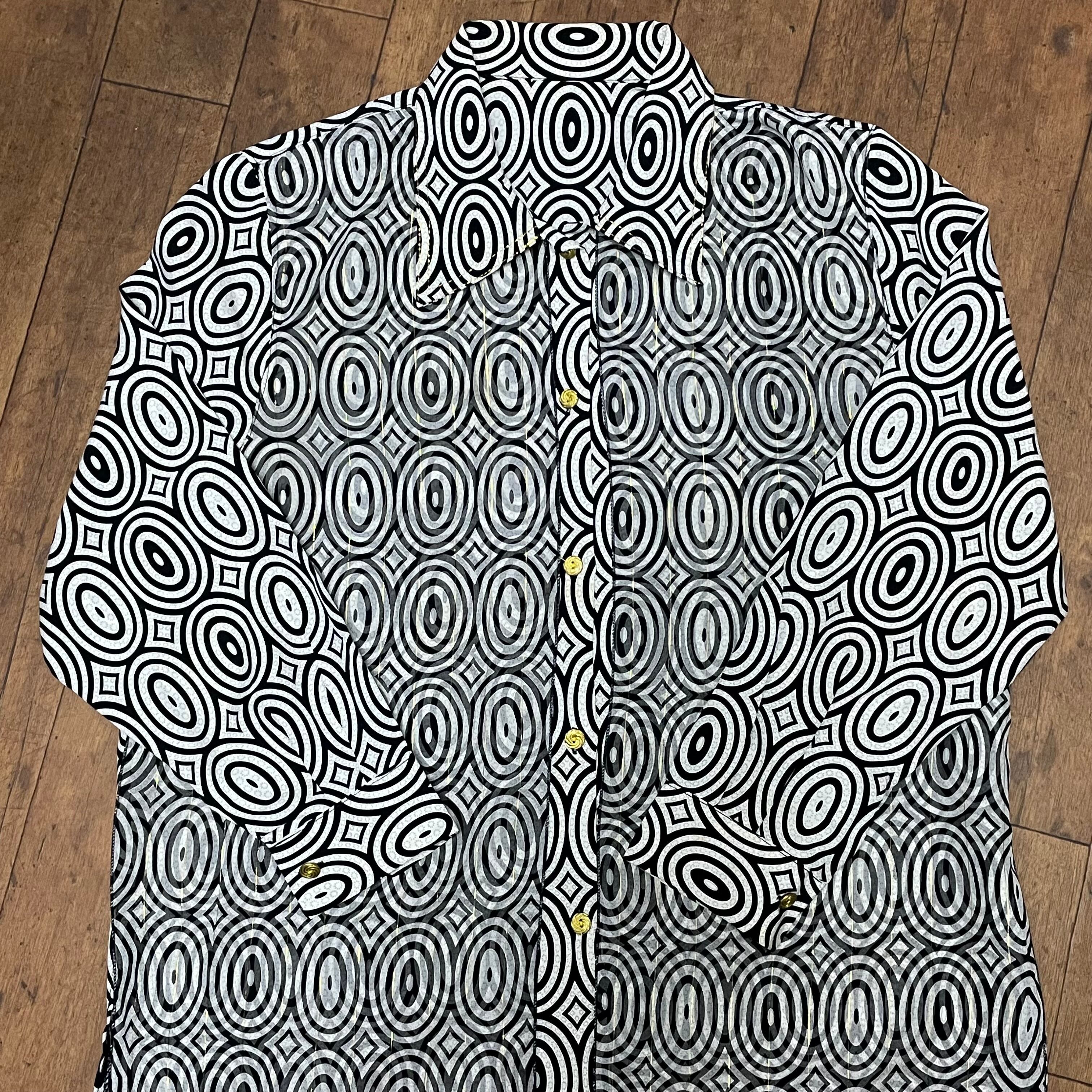 ・フロントが二枚重ねの個性的なレトロブラウスです!モノトーンなモダン柄の中に金ボタンがポイントになっていてオシャレです!